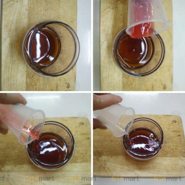 - Dùng 130ml nước cốt trà, cho 30ml mứt dâu, 20ml siro hoa hồng, 15ml đường lỏng và 5ml nước chanh.