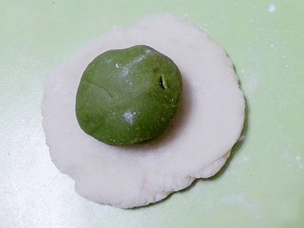 Bước 2: Rải một lớp bột áo mỏng lên trên tấm nướng, cho hỗn hợp bột ra ngoài, dùng cổ tay miết dài phần bột khoảng 5 – 6 lần để bột được mịn và dẻo. Sau đó nhanh tay ấn dẹt bột và bọc ngoài nhân bánh.
