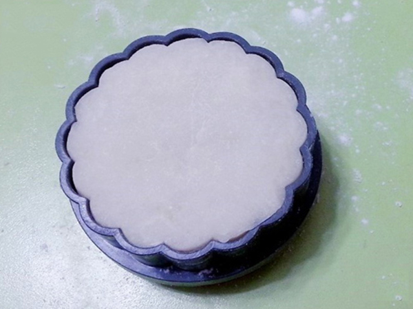 Bước 3: Rắc 1 ít bột khô vào khuôn để tạo một lớp chống dính, cho bánh vào khuôn ấn chặt tay đều các góc để tạo hình bánh, sau đó để yên khoảng 30s rồi nhẹ nhàng lấy bánh ra.