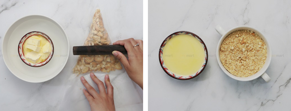 - Đổ bơ đã đun chảy vào phần đế bánh quy đã nghiền vụn, trộn đều cho bơ và bánh hoà quyện với nhau.