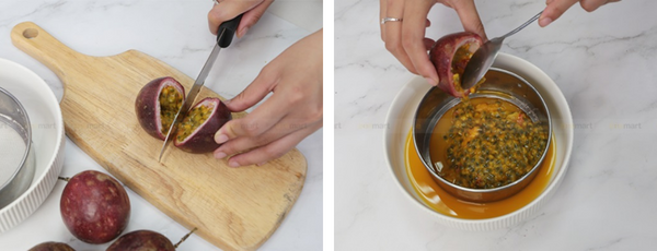 - Lọc hỗn hợp chanh leo thành 2 phần: 1 phần hạt và 1 phần nước cốt. Trong đó, phần nước cốt sẽ để riêng để làm mousse.