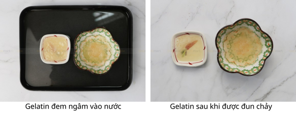 - Sau khi gelatine đã nở, đem 2 bát gelatine đi đun cách thuỷ hoặc quay trong lò vi sóng trong 15 giây. Có thể để 2 bát gelatine trong 1 tô nước nóng, gelatine sẽ tự tan chảy.