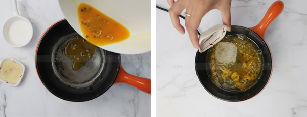 - Thêm 15g đường vào 30ml nước cốt chanh leo ở bước 3, đổ phần nước cốt này vào chảo và đun ở lửa vừa cho đường tan hết.
