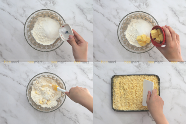 Sau đó cắt 100g bơ lạnh thành các miếng vuông nhỏ. Trộn đều bơ và bột.