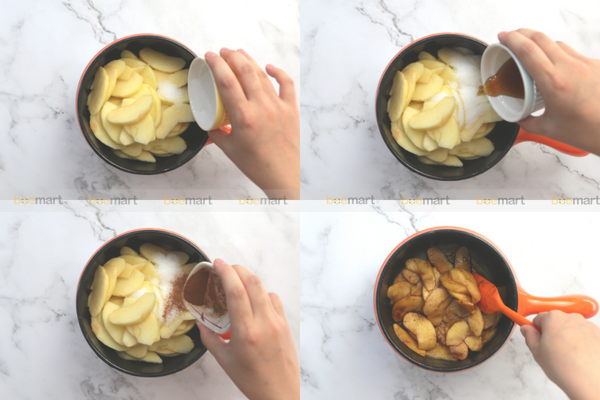 Cho phần táo đã cắt miếng vào nồi hoặc vào chảo. Thêm vào nồi 15g đường, 1g bột quế và 15g mật ong.