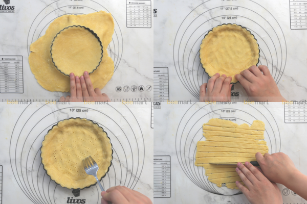 Lấy bột trong tủ lạnh ra, cán bột mỏng rồi cắt theo đường kính khuôn, phần bột thừa sẽ giữ lại để lát trang trí trên mặt bánh.