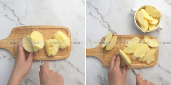 Để tiến hành làm nhân táo, trước hết bạn cần sơ chế táo. Táo rửa sạch, gọt vỏ và cắt thành các miếng mỏng như hình.