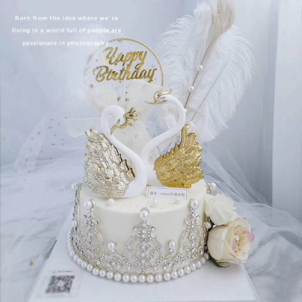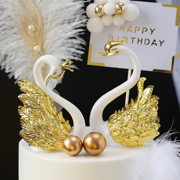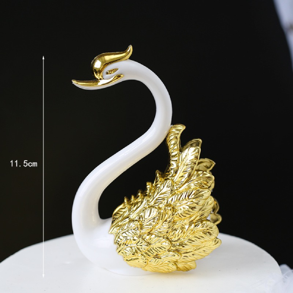 Đôi thiên nga trang trí màu vàng có kích thước khá cao, vì vậy thích hợp với những mẫu bánh size 16cm trở lên. Bạn sẽ không cần dành quá nhiều thời gian cho việc trang trí bánh nữa, chỉ cần 1 chút phụ kiện thôi là chiếc bánh của bạn đã lung linh hơn rất nhiều rồi