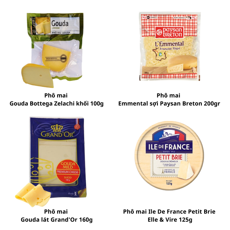 - Phô mai : Zelachi, Paysan. Grand'Or, Elle & Vire