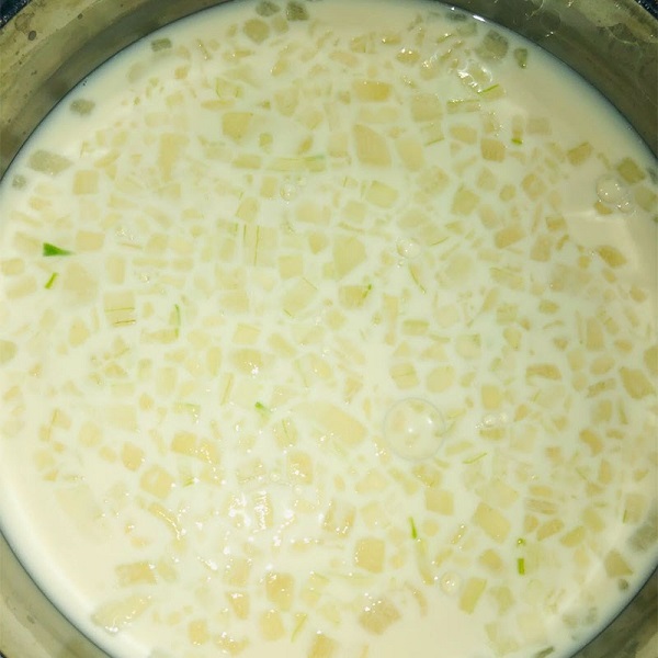 + Bắc nồi hỗn hợp sữa lên bếp nấu với lửa nhỏ, vừa nấu vừa khuấy đều tay đến khi hỗn hợp nóng từ 60 - 80 độ C thì tắt bếp và cho nha đam vào, khuấy đều và chờ hỗn hợp còn âm ấm.