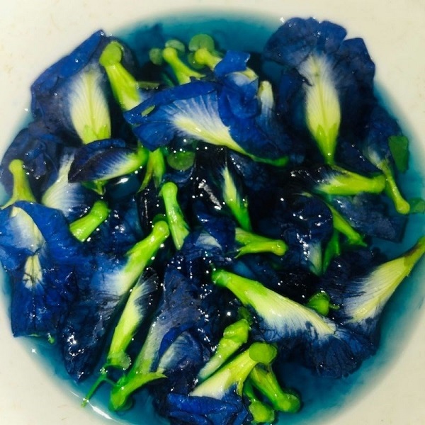 + Rửa sơ hoa đậu biếc cho sạch sau đó để ráo nước. Hoa đậu biếc sau khi đã rửa sạch thì cho ra tô, chế thêm 200ml nước sôi vào và ngâm từ 5 - 7 đến khi ra được màu xanh như ý muốn thì vớt bỏ phần xác hoa.
