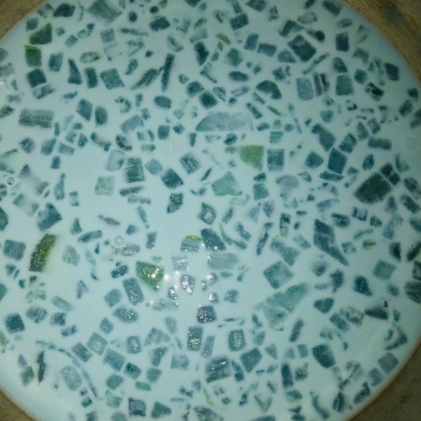 + Dùng muỗng cạo nhẹ để lấy thịt nha đam ra khỏi vỏ rồi cho vào thau nước muối pha loãng. Làm tương tự với các nhánh nha đam còn lại đến khi hết.