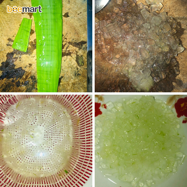 + Nha đam sau khi được tách vỏ thì đem rửa cùng với một ít nước muối pha loãng và rửa lại vài lần với nước sạch.