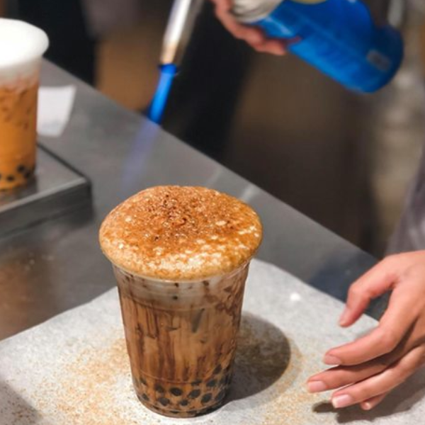 - Nếu các bạn muốn vị nướng đậm hơn thì có thể cho thêm một chút đường nâu bên trên mặt trà sữa nhé!