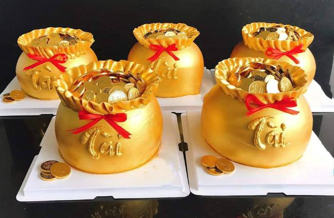 Dùng kem viết chữ tài lộc trên thân hũ theo ý muốn. Sau đó, dùng kẹo socola tiền vàng để trang trí xung quanh hũ vàng. Ngoài ra, bạn có thể dùng các đồ trang trí bánh khác như hình đồng tiền, dây nơ, mèo thần tài… cho chiếc bánh thêm xinh nhé