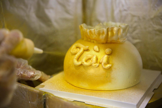 Để bánh hũ vàng có màu bóng đẹp thì bạn có thể phun thêm một lớp màu nhũ màu vàng gold xung quanh bánh nhé!