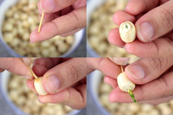 Cách 2: Bạn cắt một phần nhỏ chỉ bằng đầu tăm ở đầu hạt sen. Tiếp theo, bạn bẻ đi phần nhọn của đầu tăm và trực tiếp dùng tăm chọc qua lỗ đối diện chỗ vừa cắt, xuyên qua hạt sen theo phương dọc. Lúc này, tâm sen sẽ được loại bỏ và đi ra từ vị trí bạn đã cắt trên đầu sen khi nãy. Vậy là tâm sen đã được loại bỏ mà hạt sen vẫn giữ được hình dáng nguyên vẹn.