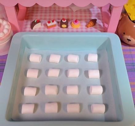 Bước 1: Xếp những viên mashmallow ra khay nướng.