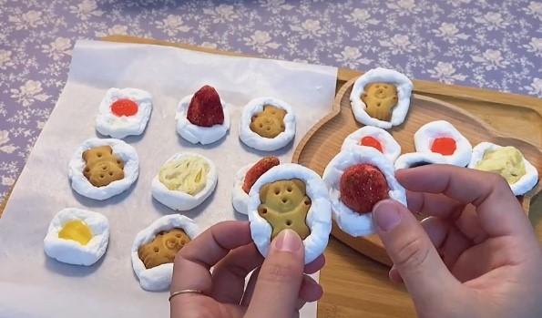 Bước 3: lấy khay nướng ra khỏi lò, dùng tay ấn các loại đồ ăn vặt lên miếng mashmallow và để nguội cho viên mashmallow cứng lại vậy là chúng ta đã có món kẹo nougat siêu đặc biệt.