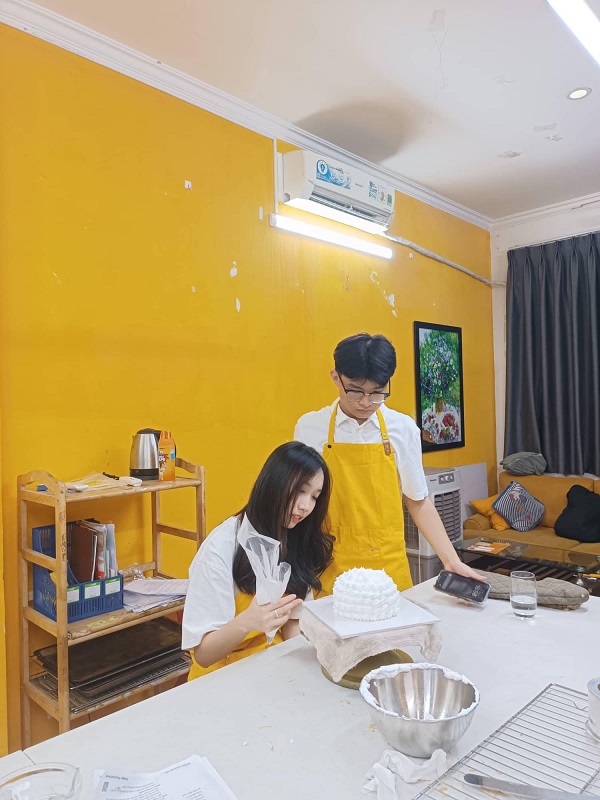 Đôi bạn tham gia lớp học làm bánh gato kem tươi