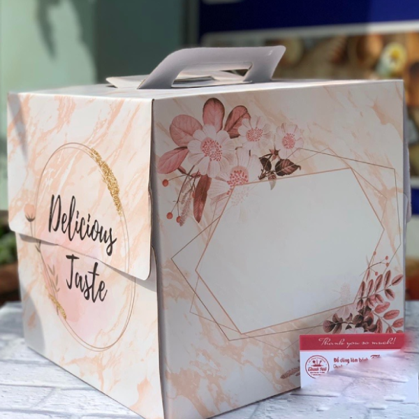 Kích thước hộp size đáy: 20cm; cao 16cm phù hợp và thoải mái với hầu hết các loại bánh lớn. Thiết kế quai xách tiện lợi dễ dàng cầm nắm khi di chuyển. Thiết kế màu hồng nhạt cùng hoa văn đơn giản, tinh tế mà vẫn bắt mắt có thể sử dụng cho nhiều hoàn cảnh, đối tượng khác nhau.