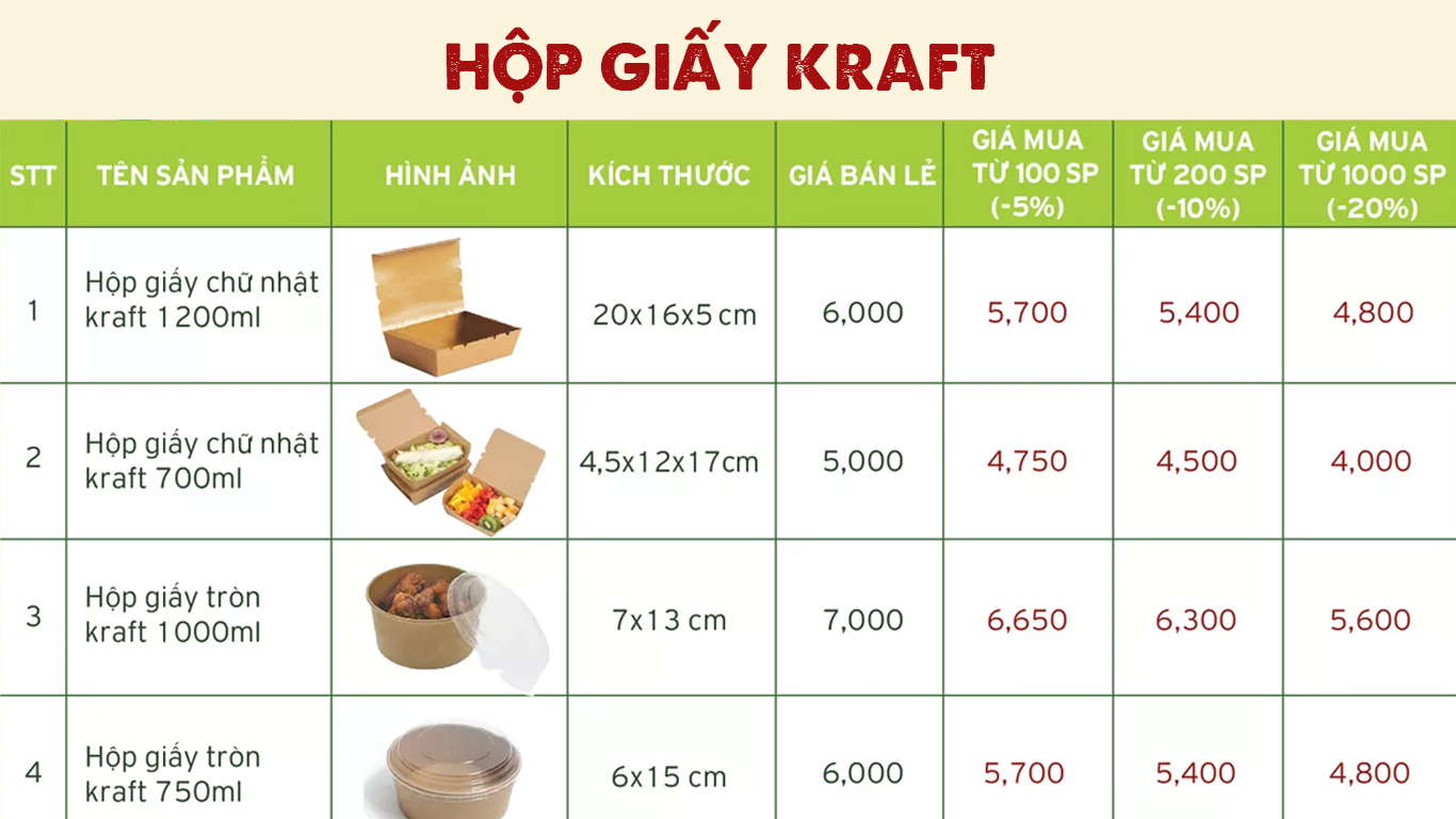 Ngoài hộp giấy tròn kraft 750ml, Beemart còn loại Hộp giấy tròn kraft 1000ml. Thêm nữa là các hộp giấy đựng đồ ăn nhanh với hình chữ nhật với các kích cỡ 700ml, 1200ml,... giúp gia tăng sự lựa chọn cho khách hàng.