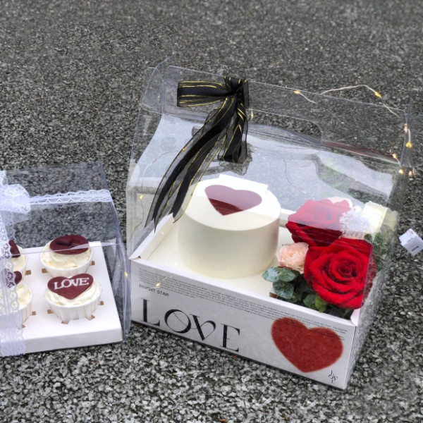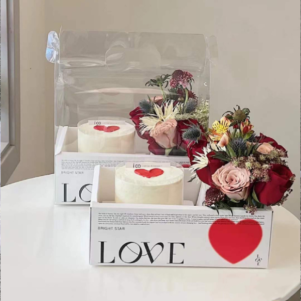 Phần hộp giấy in màu trắng tinh tế và hình trái tim đỏ bắt mắt. Hộp được chia làm 2 ngăn đủ để đựng một chiếc bánh nhỏ và hoa. Phần nắp hộp mica có kèm theo quai xách tiện lợi. Chỉ cần chuẩn bị hoa và 1 chiếc bánh nhỏ xinh là bạn đã có ngay món quà xinh xắn dành tặng người thương rồi đó!