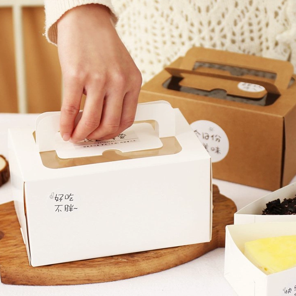 Hộp đựng bánh làm từ giấy kraft trắng dày dặn, chắc chắn đi kèm với phần quai xách tiện lợi giúp những chiếc bánh đặt bên trong được bảo quản cẩn thận. Đặc biệt hộp còn có phần bóng kính trên nắp hộp có thể nhìn được chiếc bánh xinh xắn bên trong.