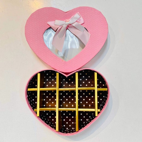 Hộp có thiết kế hình trái tim đựng được 13 viên socola kích thước mỗi ô khác nhau với nắp có lớp nhựa trong suốt làm tăng thêm phần lung linh, độc đáo cho món quà.