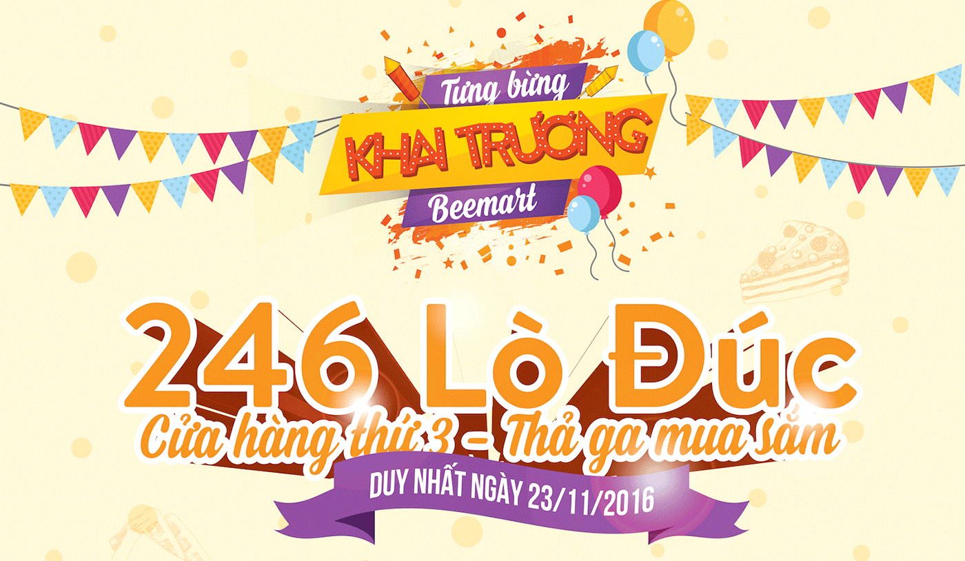 Beemart chào đón thành viên thứ 3 tại địa chỉ 246 Lò Đúc ( quận Hai Bà Trưng, Hà Nội) với chương trình ưu đãi đặc biệt hấp dẫn " Cửa hàng thứ 3 - Mua sắm thả ga". Hàng ngàn sản phẩm dụng cụ,khuôn khay làm bánh giảm đồng loạt 20% , sản phẩm nguyên liệu làm bánh giảm đồng loạt 5% cùng bạt ngàn quà tặng giá trị trong ngày 23/11/2016.
