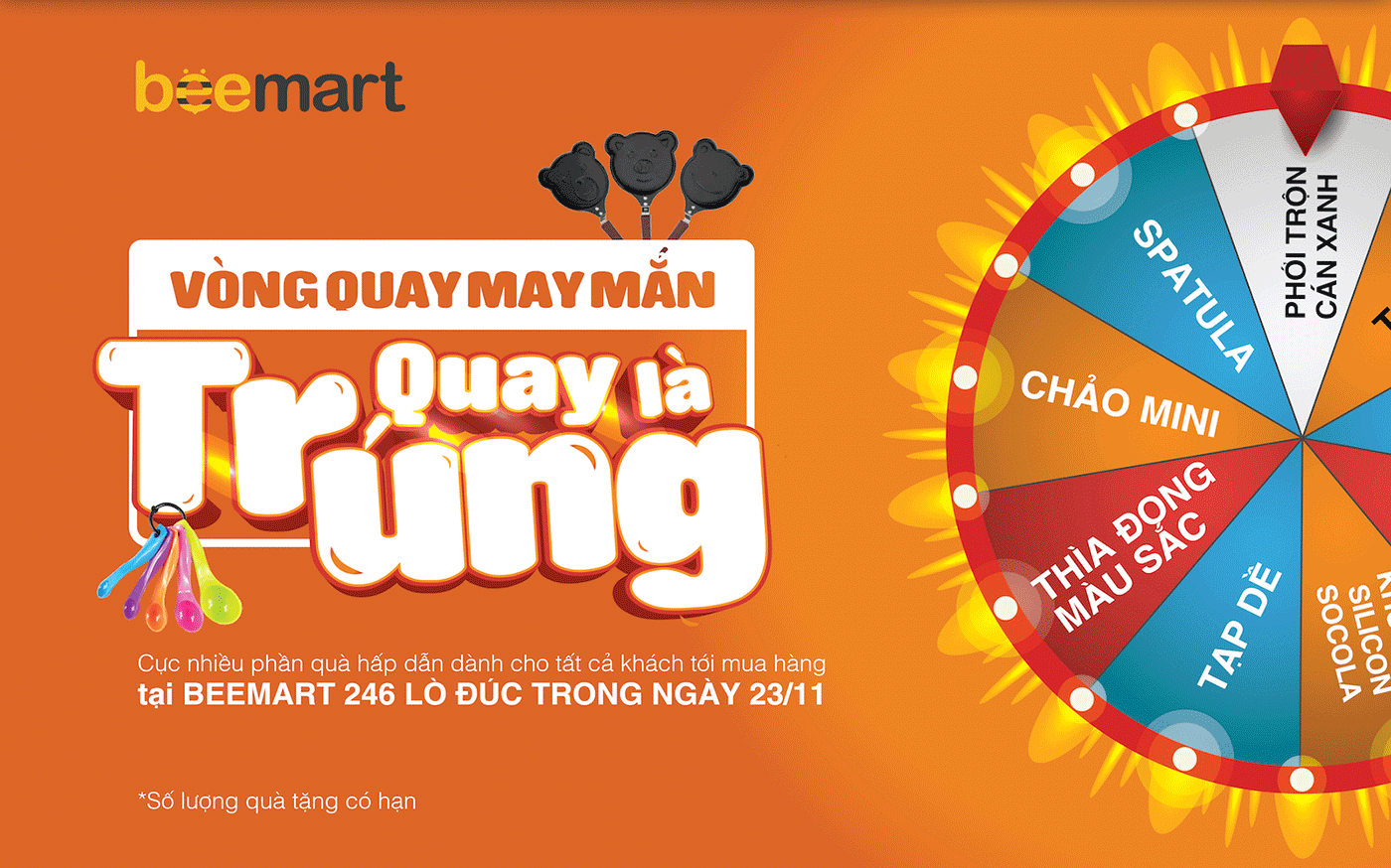Với 100 khách hàng đầu tiên mua hàng tại Beemart Lò Đúc bạn sẽ được tham gia vòng xoay may mắn với 100% cơ hội nhận những món quà hấp dẫn như Spatula, phới lồng đánh trứng, khuôn silicon, chảo nướng mini, bộ thìa đong, ramenkin, tạp dề .... Cứ quay là trúng với vòng xoay may mắn của Beemart.