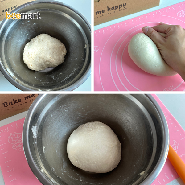 - Nhào bột với thao tác đập bột và gập bột bánh khoảng 10 lần cho đến khi thấy bột mịn