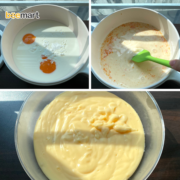 - Cho vào chảo 220g sữa tươi, 2 lòng đỏ trứng, 25g đường, 15g bột bắp, một chút vani và trộn đều cho đến khi hòa quyện