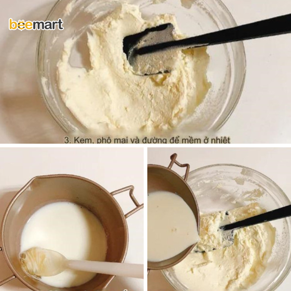 + Để mềm cream cheese ở nhiệt độ phòng, thêm 50g đường và trộn đều đến khi tan hòa quyện