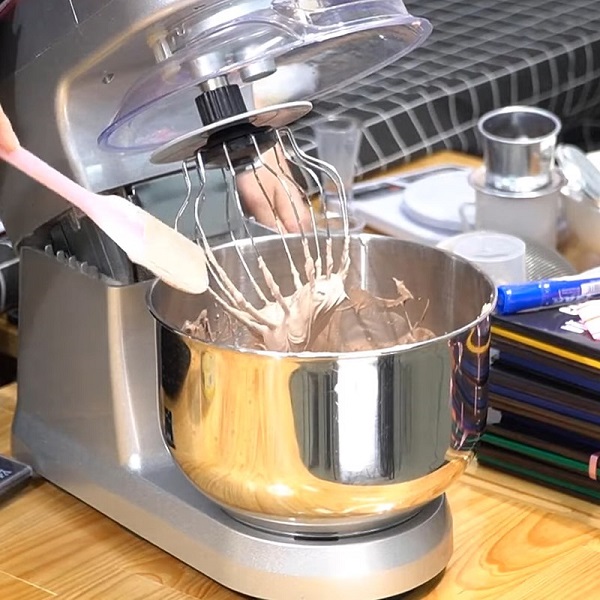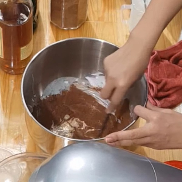 Cho vào tô 125ml kem thực vật ít béo (Topping base), 75ml kem sữa béo (Rich lùn), 30ml siro đường, 10ml rượu rum, 15ml sữa đặc, 1g muối, 20ml nước cốt cà phê, 15gr bột cacao. Trộn đều các nguyên liệu bằng phới.