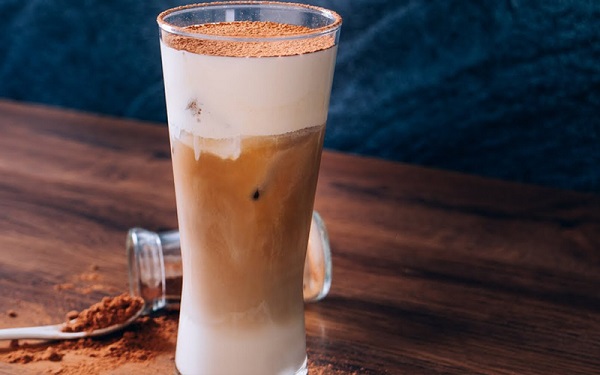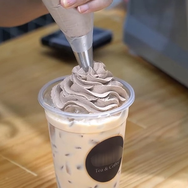 Cho ra ly phần trà sữa hoặc cafe đã chuẩn bị, thêm đá đầy ly. Bơm phần trong túi bắt kem vừa hoàn thành lên trên phần đá ở miệng ly. Rắc thêm một chút bột cacao để trang trí. Vậy là món nước đặc biệt của bạn đã được hoàn thành rồi, thưởng thức thôi nào.