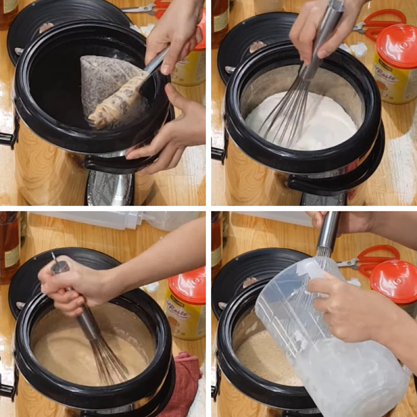Sau 20 phút ủ, lấy túi trà ra khỏi bình giữ nhiệt, vắt hết nước cốt còn lại trong túi lọc. Tiếp đến, cho vào bình giữ nhiệt 400gr bột béo rồi khuấy đều cho bột tan. Khi phần bột béo đã tan, bạn cho vào thêm 300ml sữa đặc, 2.5gr muối và tiếp tục khuấy cho sữa tan. Cuối cùng, cho vào 700gr đá viên, khuấy đều đến khi đá tan hoàn toàn là được. Lượng nguyên liệu trong công thức đủ cho khoảng 15 ly trà sữa