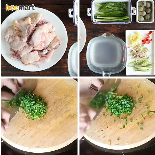 + Gừng gọt bỏ vỏ, rửa sơ với nước rồi băm nhỏ. Hành lá cắt bỏ rễ, rửa sạch, để ráo rồi cắt nhỏ.