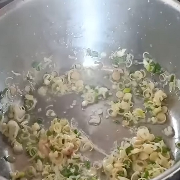 + Bắc nồi lên bếp, cho vào nồi 3 muỗng canh dầu ăn. Đợi dầu nóng, cho hết phần còn lại của hành tím, tỏi, sả, gừng, hành lá vào phi vàng thơm.