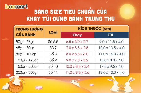 Lưu ý: Tham khảo ngay bảng size tiêu chuẩn của khay túi đựng bánh trung thu để lựa chọn đúng sản phẩm phù hợp với nhu cầu bạn nhé!
