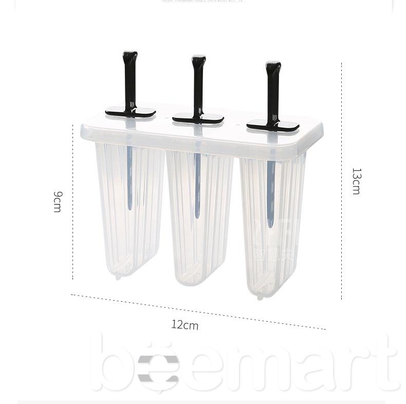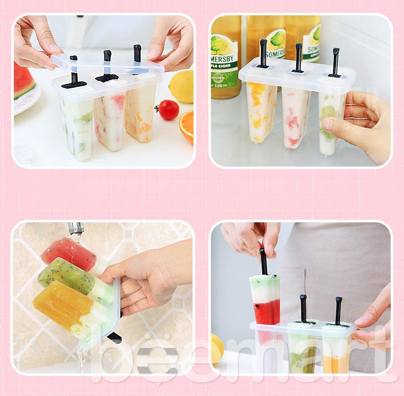 Khuôn kem gồm 3 bộ phận: 1 lòng khuôn (3 ô), 1 nắp khuôn, 3 que cắm, tháo lắp dễ dàng, đồng thời đảm bảo rất dễ vệ sinh sau khi sử dụng.