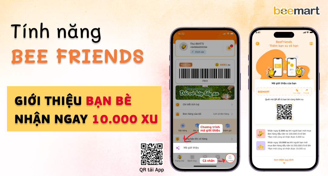 - Beemart không giới hạn số lượt giới thiệu bạn bè, vì vậy bạn có thể nhận xu vô hạn từ chương trình này và sử dụng để mua hàng miễn phí trên App Beemart!