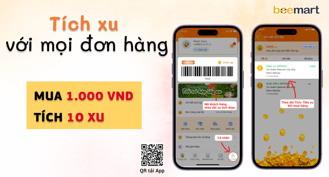 Ví dụ: bạn mua đơn hàng trị giá 240.000đ trên App Beemart, bạn sẽ được tích 2.400 xu vào tài khoản.