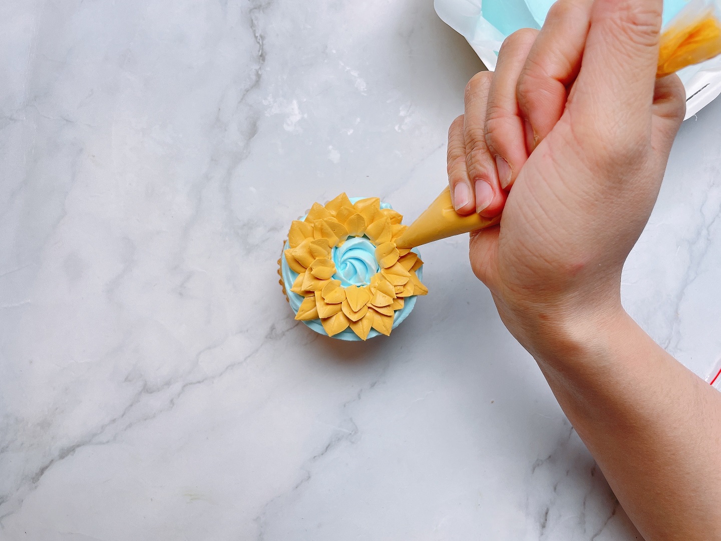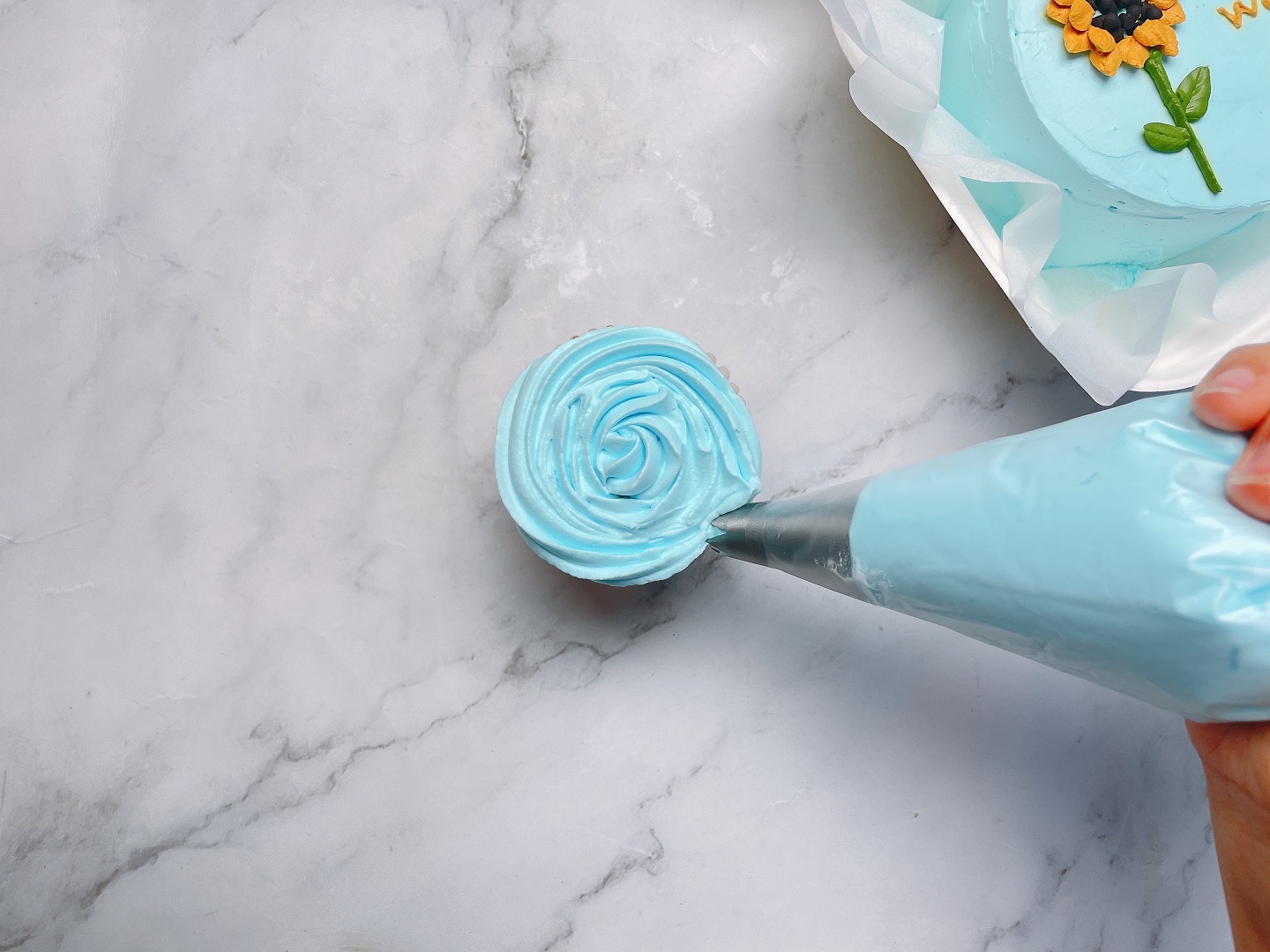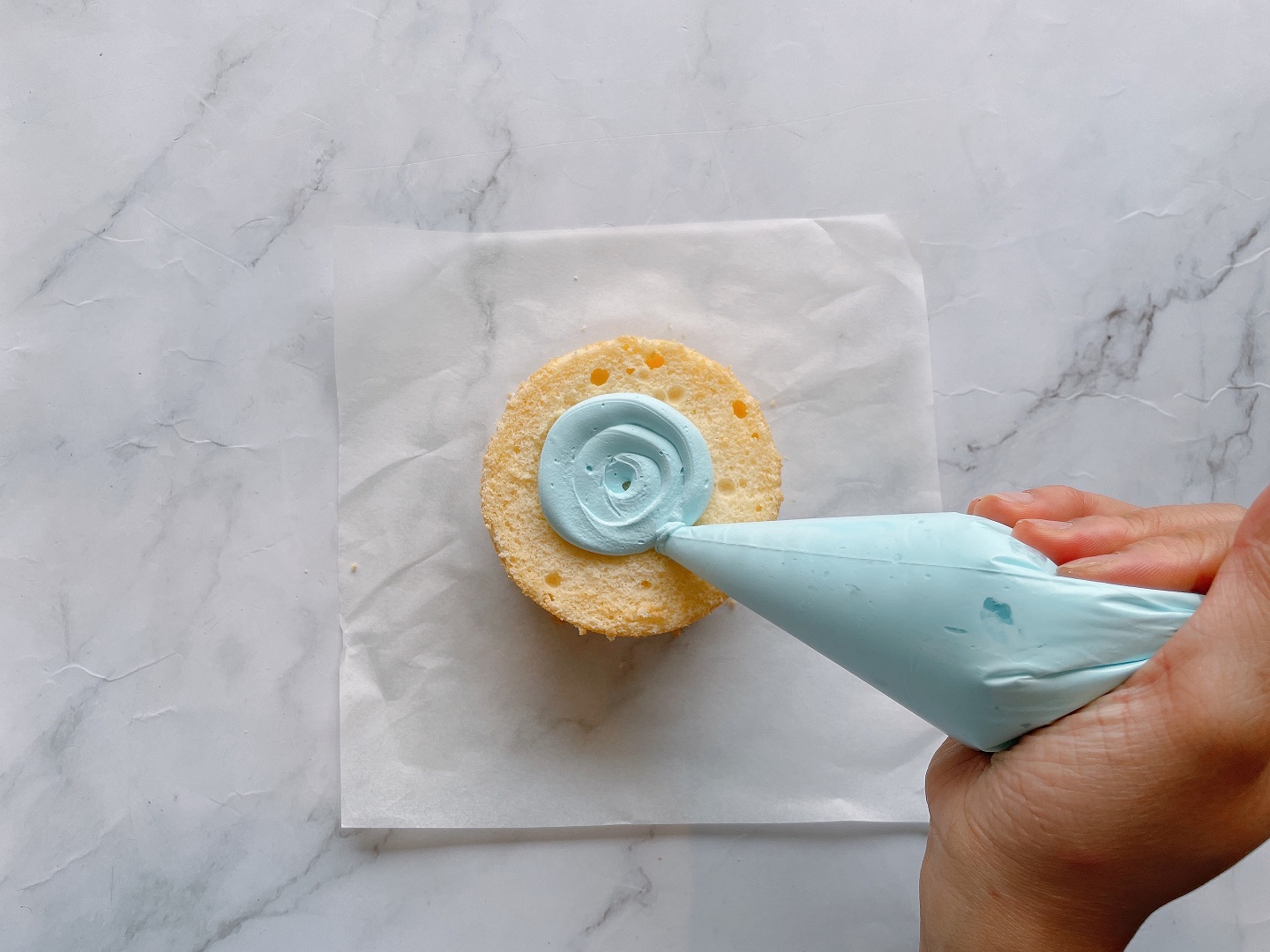 - Dùng túi kem xanh da trời nhạt để phủ kín bề mặt của 2 chiếc cupcake. Bạn có thể bóp kem theo hình tròn hoặc bơm kem để chà láng bằng phẳng trên bề mặt bánh.