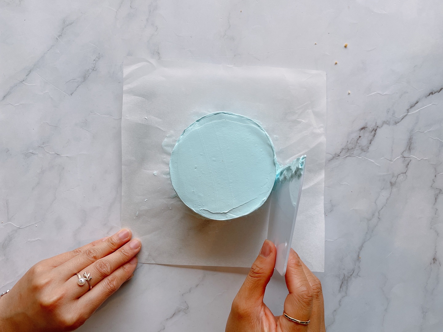 - Đặt bánh lên trên 1 một phẳng, nếu không có bàn xoay, bạn có thể đặt lên 1 cái đĩa, lót 1 tờ giấy nến lên trên bề mặt và đặt cốt bánh lên trên.
