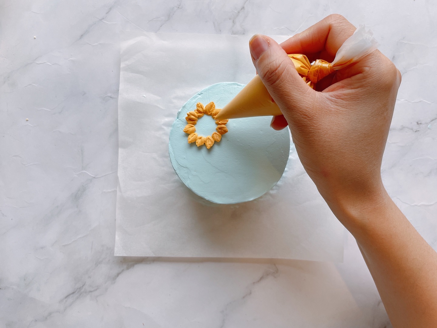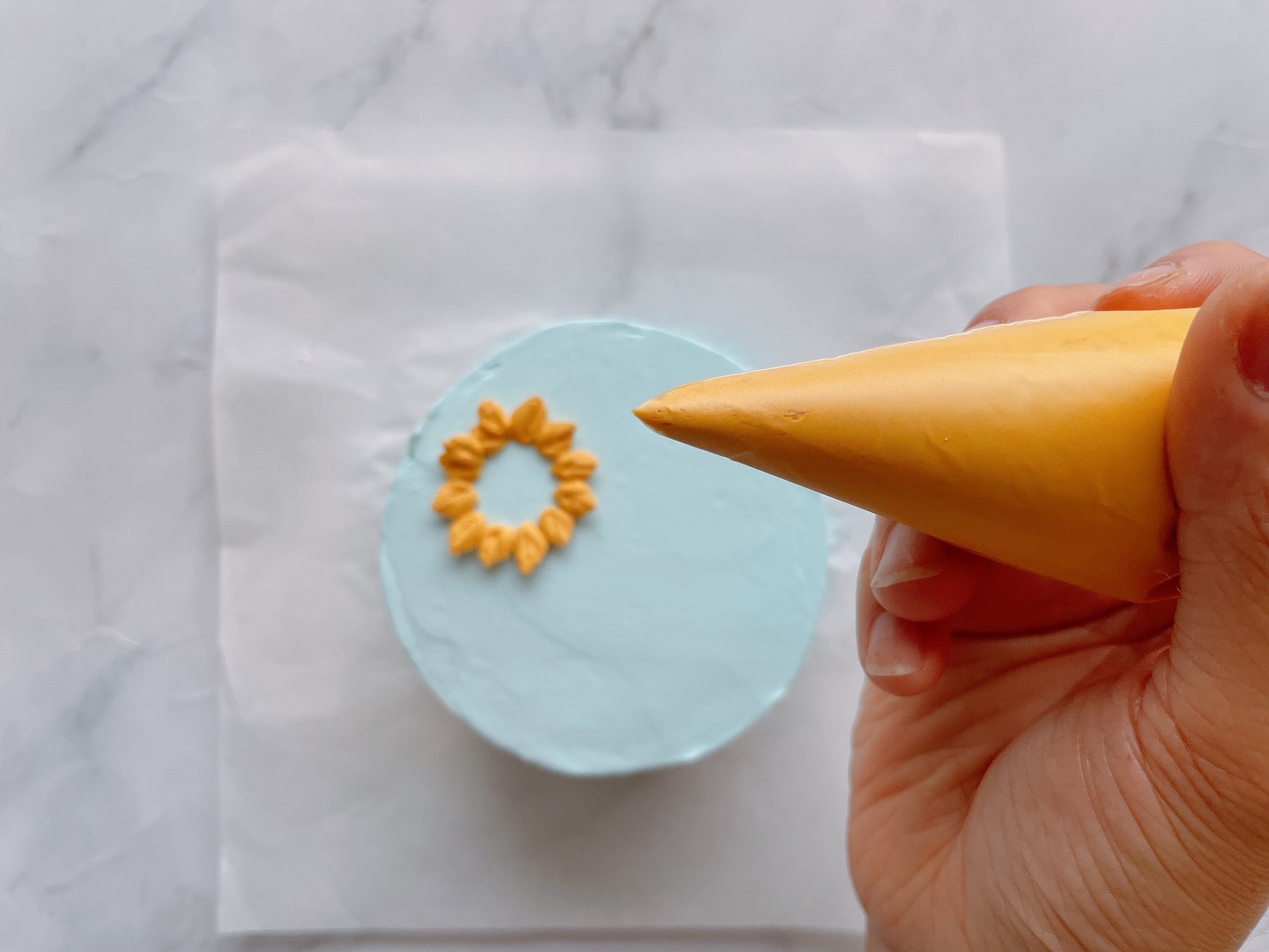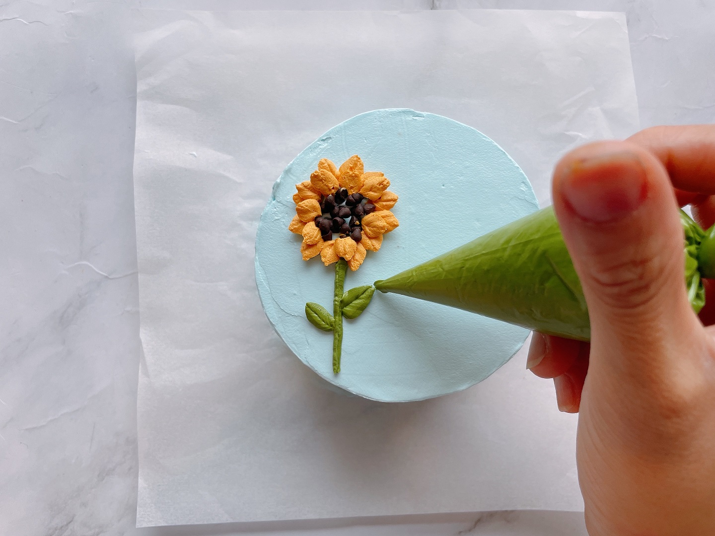 - Đầu tiên bạn dùng tăm vẽ phác lên trên bề mặt bánh theo hình mẫu của chúng mình. Sau đó từ từ dùng túi bắt kem màu vàng để vẽ cánh hoa, màu xanh để vẽ lá.