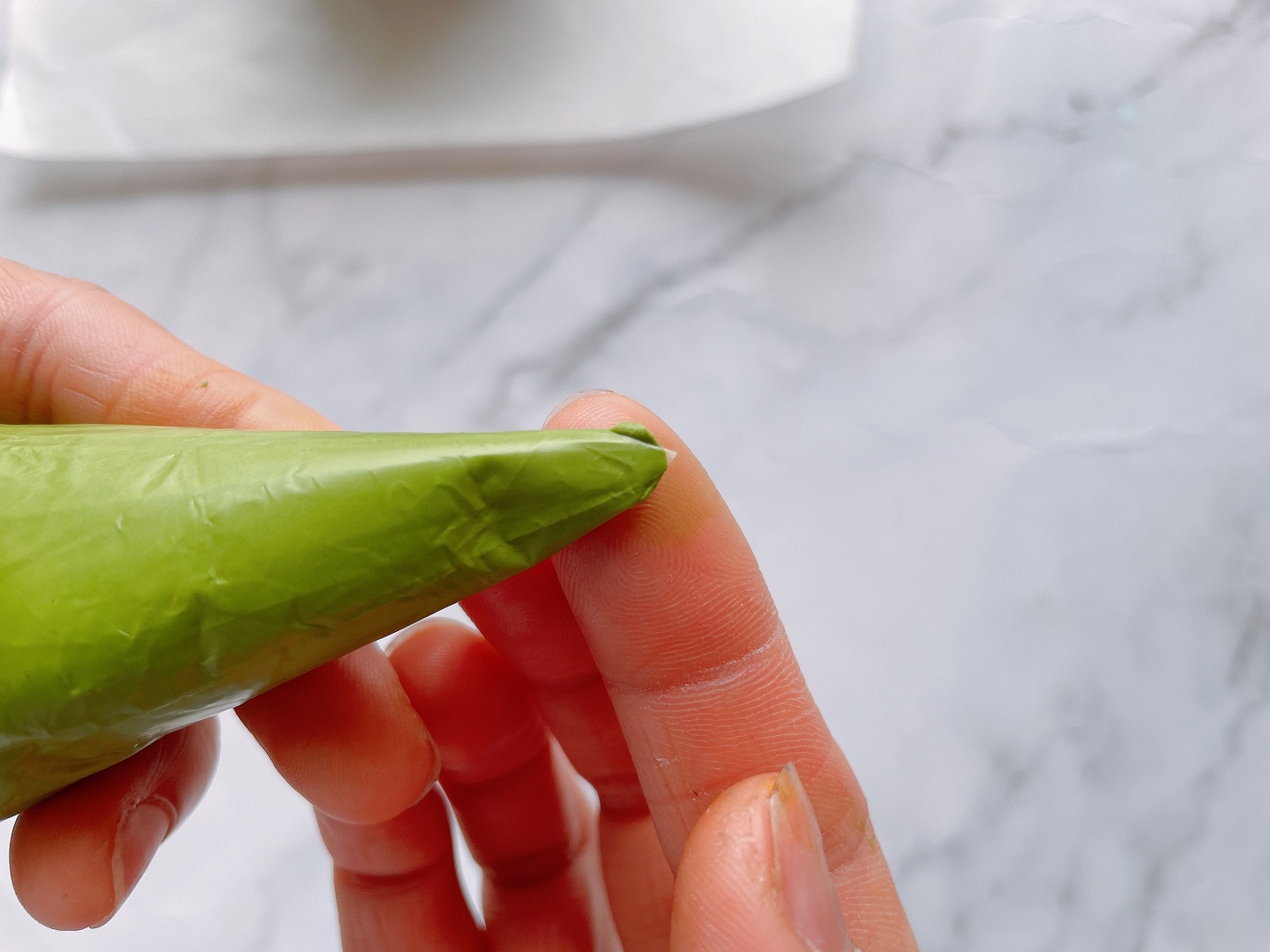 - Sử dụng 2 túi kem màu vàng và màu xanh lá để vẽ hoa. Với 2 túi này bạn dùng kéo cắt vát 2 cạnh theo hình mũi tên để tạo thành hình mũi nhọn ở đầu túi bắt kem. Lưu ý cắt nhỏ từ từ để có thể dễ dàng điều chỉnh bạn nhé.