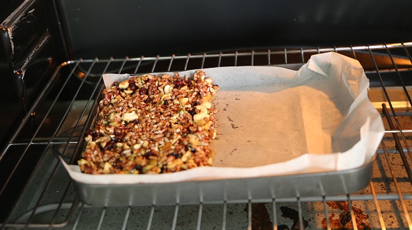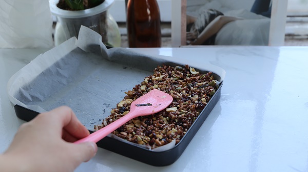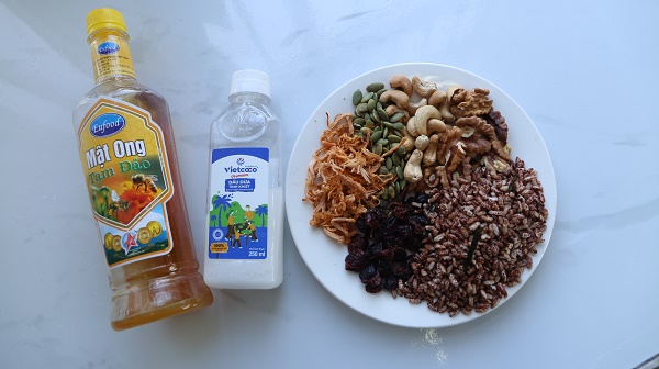 Cho dầu dừa và mật ong vào chảo để lửa vừa, đảo nhẹ đến khi hòa quyện. Đun đến khi hỗn hợp chuyển qua màu caramel hay còn gọi là màu cánh gián thì tắt bếp. Đổ hỗn hợp trên vào các loại hạt và cốm gạo lứt, đảo thật đều và nhanh tay rồi đổ hỗn hợp vào khuôn đã lót giấy nến, nén thật chặt để tránh bị rời các loại hạt ra ngoài.