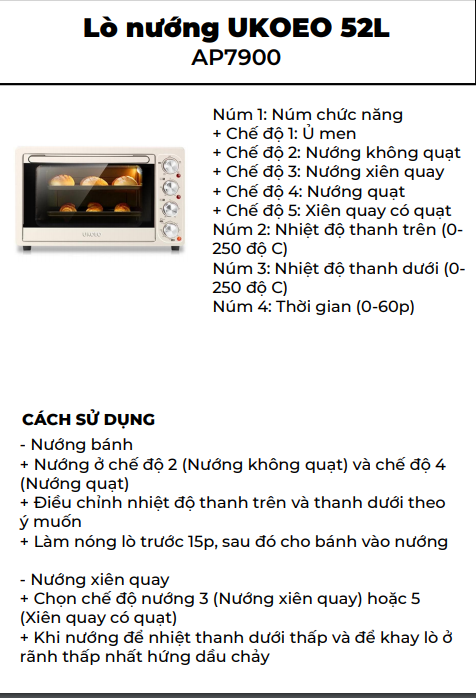 Freeship đơn đầu tiên khi nhập mã "FREEMOI"Lò nướng UKOEO 52L hiện thực hóa giấc mơ làm bánh ngon, nấu ăn kéo của những người nội trợ. Nhỏ gọn, dễ sử dụng, nhiều chức năng, giá hợp lý,... là những ưu điểm của sản phẩm bên cạnh nhiều "điểm mạnh" khác.