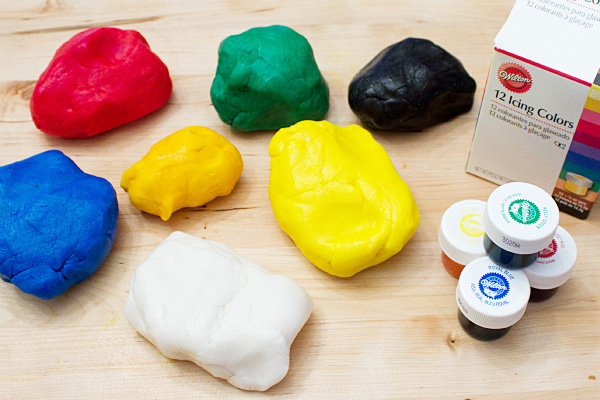 Bước 4: Muốn tạo màu thì bạn cho 1 ít màu cần dùng vào fondant rồi nhồi kỹ cho màu hòa quyện và đều màu.